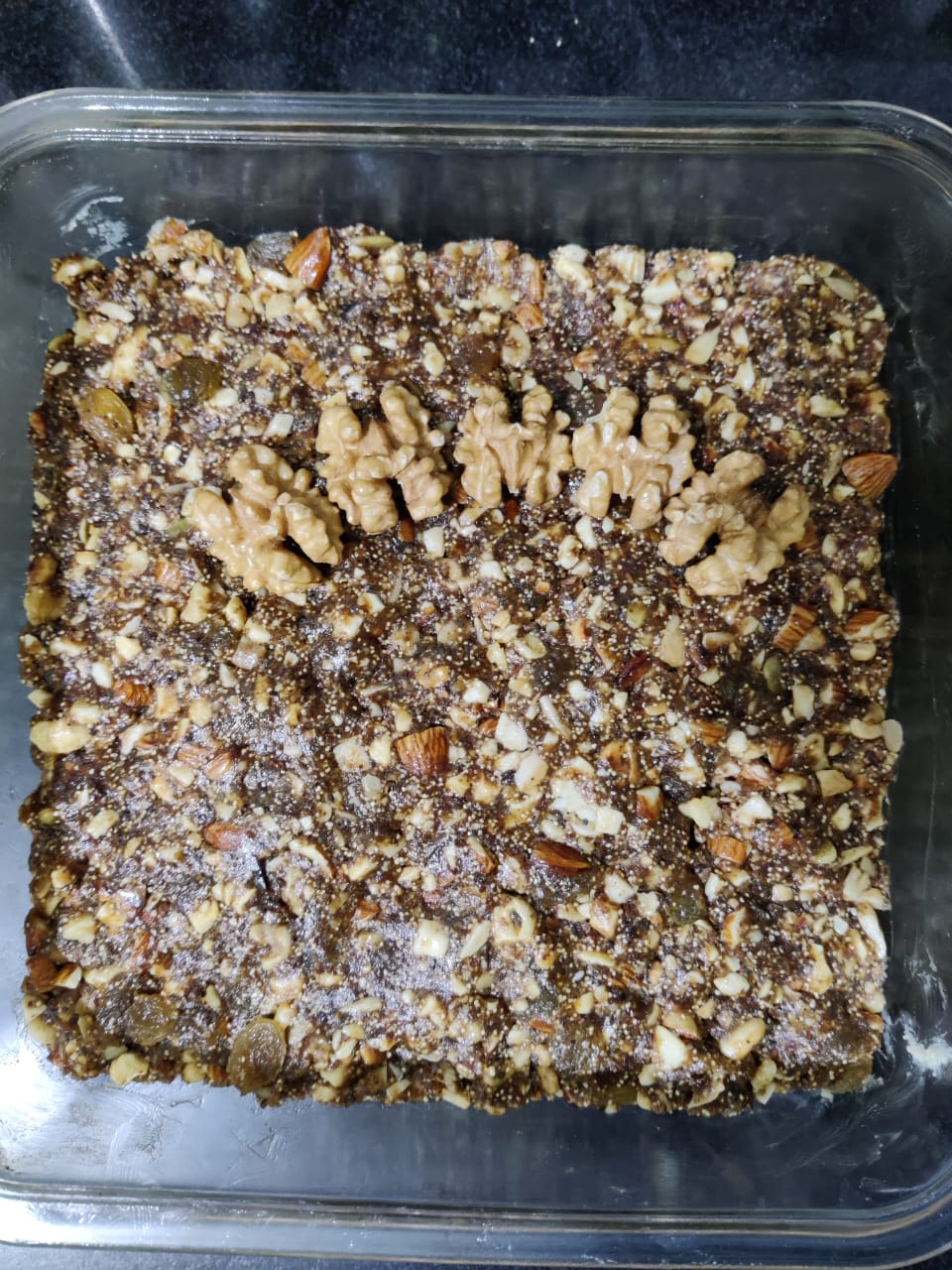 How to Make, : Cut the nuts into small pieces except raisin , now take a pan put on the gas stove now add one spoon ghee in it and slightly roast nuts in it except dates & raisins. Once these nuts are roasted keep them aside, now take dates & raisins slightly warm them in that same pan, when they become soft remove from the stove. Mix all the ingredients together properly with your hands. Take one dish ,apply some oil in it with brush. Put allthe prepared dry fruit mixture in it and set it properly. Wait for an hour till that time it will set properly.Now you cut it in the shape whichever you feel like ,it is ready to energize you.